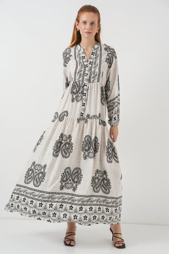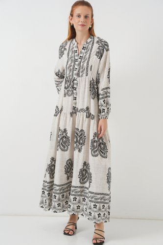 Desenli Uzun Tesettür Elbise 2585 - Taş