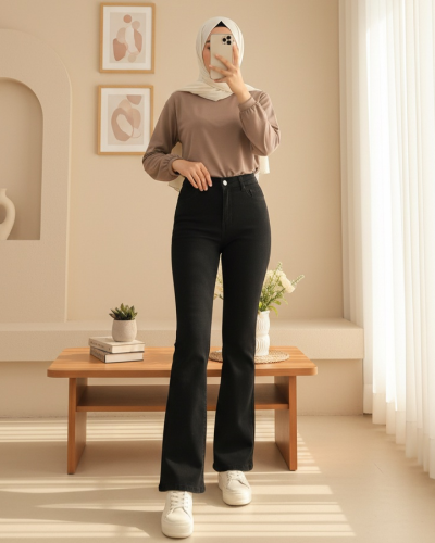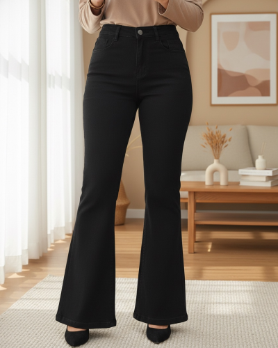 Cepli İspanyol Paça Fermuarlı Kot Pantolon -Siyah