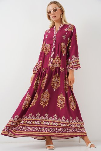 2423 Otantik Desenli Tesettür Elbise - Z.Bordo