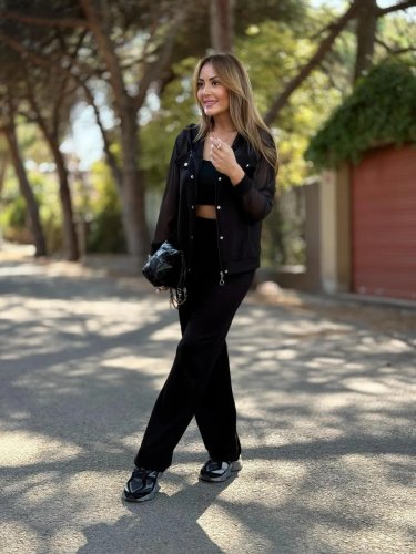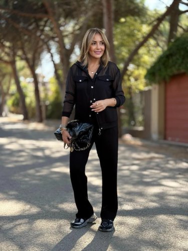 Kadın uzun kollu tül detaylı önü düğmeli viskon iki iplik ceket ve pantolon ikili takım
