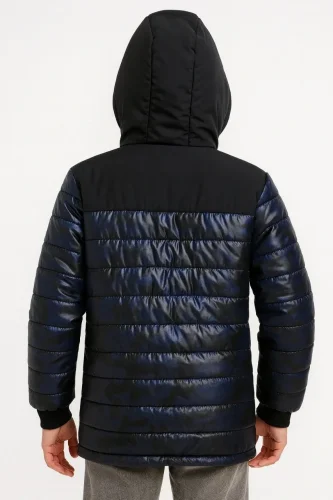 Erkek Çocuk Kamuflaj Desenli Mont İçi Sıcak Tutan Pelüş Astarlı Kapüşonlu Fermuarlı Kışlık Su İtici Şişme Mont - Lacivert
