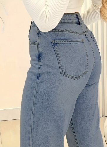 Kadın yüksek bel cepli paçaya doğru geniş kot pantolon