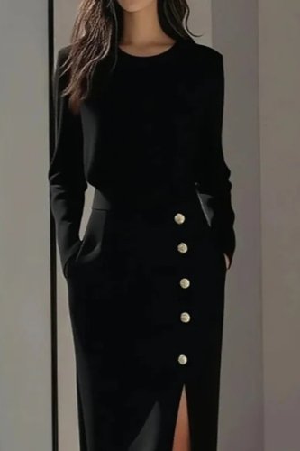 Kadın uzun kollu bisiklet yakalı yandan yırtmaçlı düğmeli midi ithal krep elbise