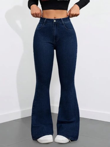 Kadın yüksek bel cepli İspanyol paçalı kot pantolon
