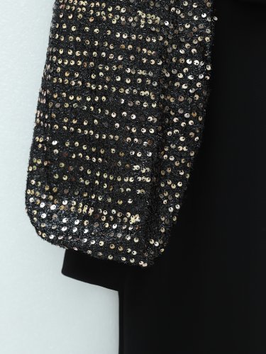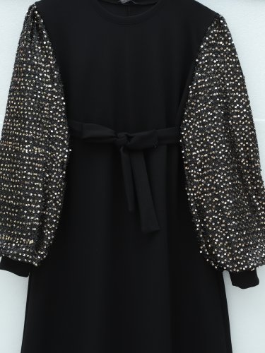 Kolları Pullu Kemerli İthal Likralı Krep Elbise -Altın