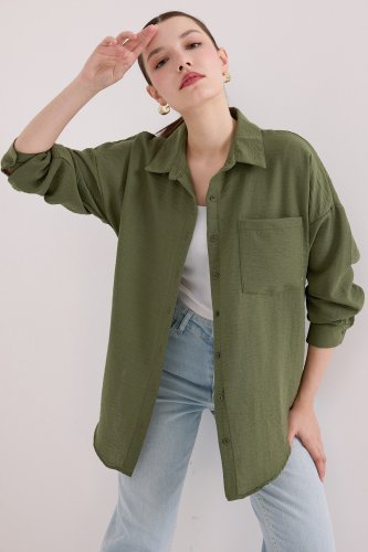 20153 Tek Cepli Oversize Keten Gömlek - Haki