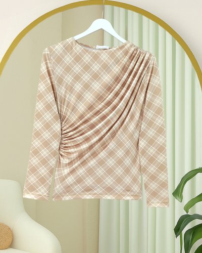 Yanı Büzgülü Ekose Desenli Bluz -Bej