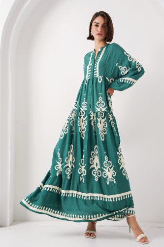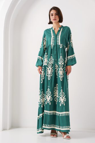 2423 Otantik Desenli Tesettür Elbise - A Zümrüt Yeşili