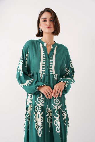 2423 Otantik Desenli Tesettür Elbise - A. Zümrüt Yeşili