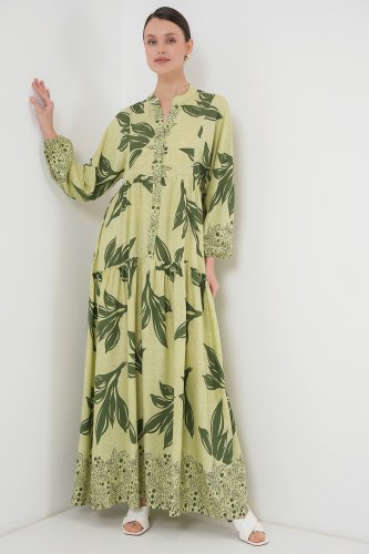 2423 Otantik Desenli Tesettür Elbise - Yeşil 4