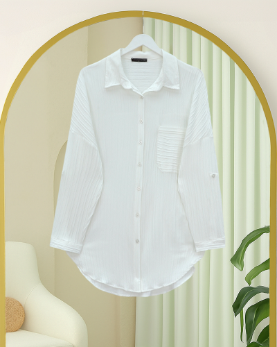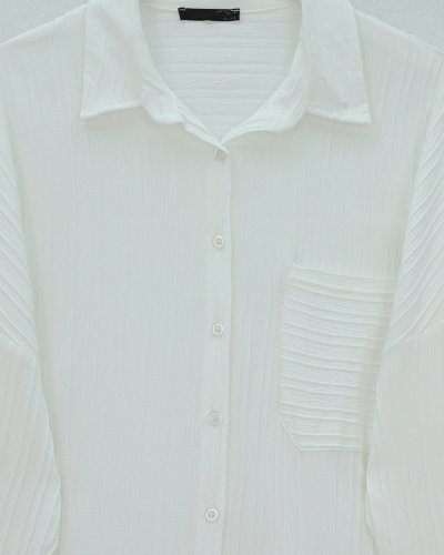 Tek Cepli Çizgi Desen Krinkıl Gömlek -Beyaz