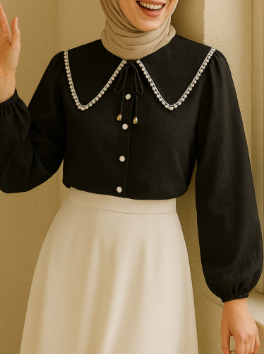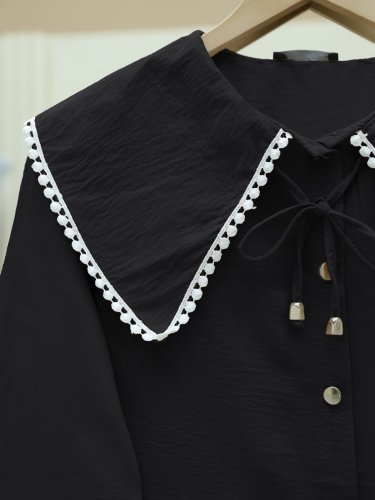 Bebe Yaka Dantelli Kolu Lastikli Gömlek -Siyah