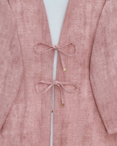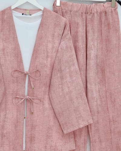 Önü Bağlamalı Pantolonlu Keten Kimono Takım -Pudra