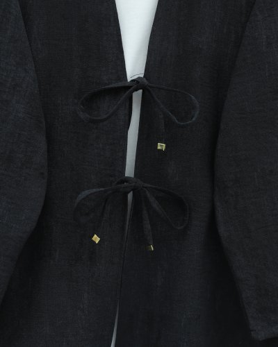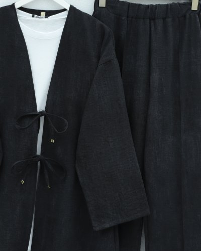 Önü Bağlamalı Pantolonlu Keten Kimono Takım -Siyah