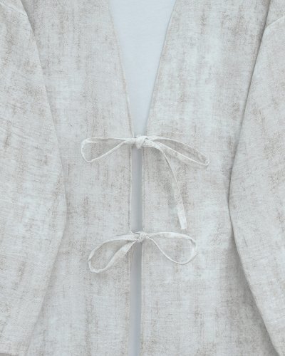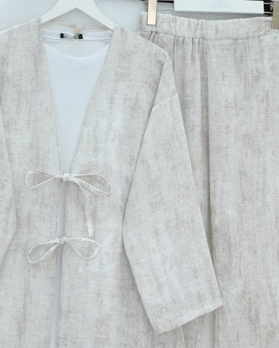 Önü Bağlamalı Pantolonlu Keten Kimono Takım -Taş