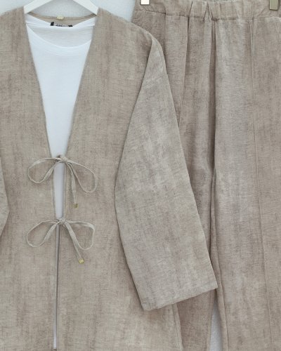 Önü Bağlamalı Pantolonlu Keten Kimono Takım -Vizon
