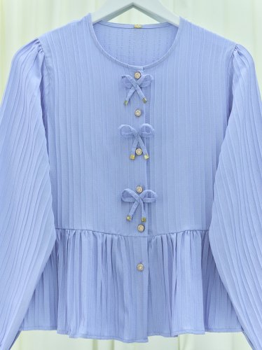 Önü Fiyonk Detaylı Düğmeli Kolu Lastikli Bluz -Mavi