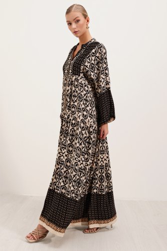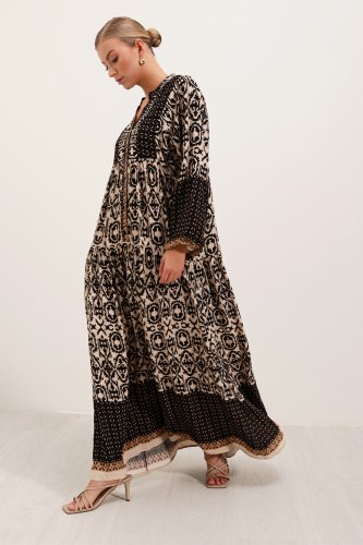 Siyah Bej Desenli Viskon Tesettür Elbise 2423