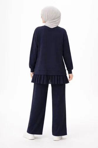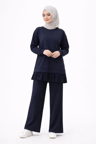 Osy Modal yumuşak dokulu Tesettür Pliseli Takım Uzun Tunik Pantolon İkili Kombin - Lacivert
