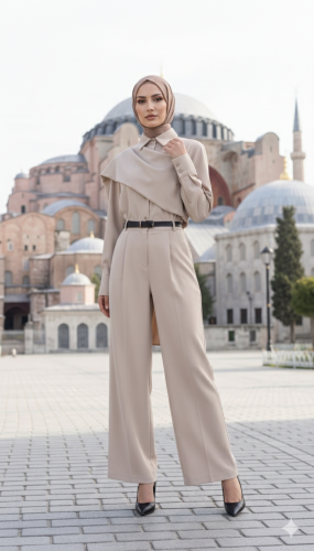 Kadın uzun kollu şal detaylı bluz ve pantolon kemer dahil ikili takım