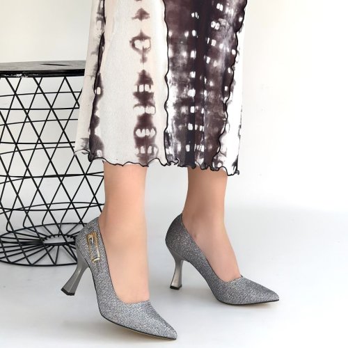 Cerin Gümüş Saten Simli Topuklu Ayakkabı