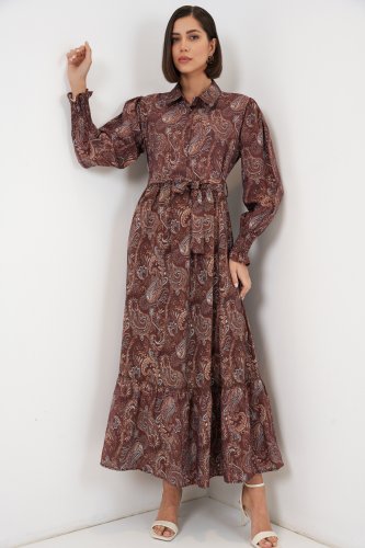 Kuşaklı Tesettür Elbise 2589 - Kahverengi