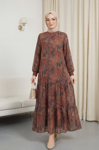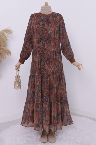 Etnik Desen Eteği Parçalı Astarlı Şifon Elbise -Kahve