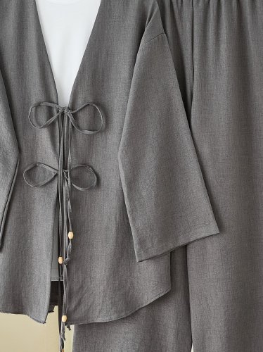 Önü Çift Bağlamalı Pantolonlu Kimono Takım -Antrasit