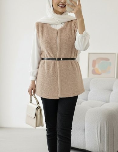 Beli Kemerli Çift Cepli Astarlı Peluş Yelek -Bej