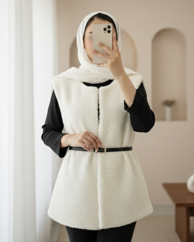 Beli Kemerli Çift Cepli Astarlı Peluş Yelek -Ekru