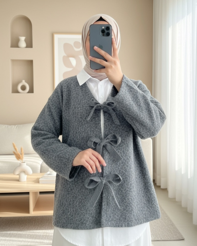 Önü Bağlamalı Kırçıllı Kaşe Ceket -Gri
