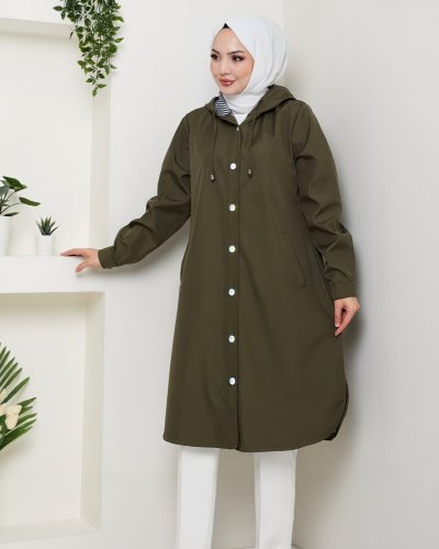 Astarı Çizgili Yan Cepli Kapşonlu Trençkot -Haki