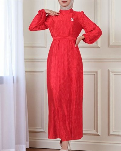 Kemerli Pliseli Saten Elbise -Kırmızı
