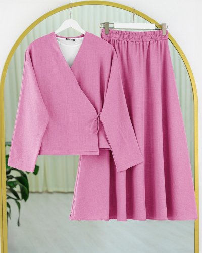 Yandan Bağlamalı Etekli Keten Takım -Pembe
