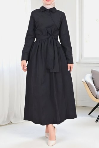 Çapraz Düğmeli Beli Bağlamalı Gömlek Yaka Elbise -Siyah