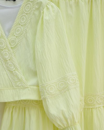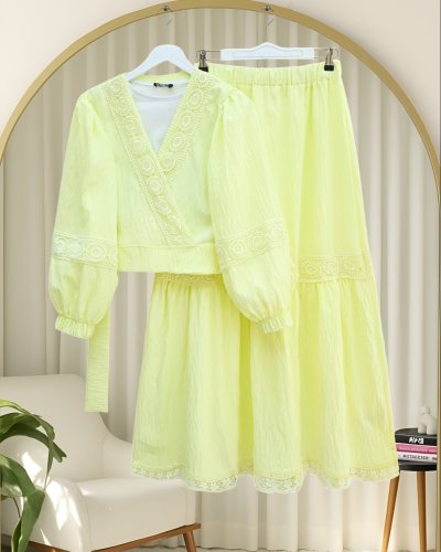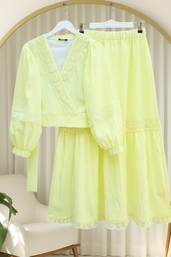 Dantel Detaylı Bağlamalı Kolu Lastikli Kraş Etekli Takım -Açık Sarı
