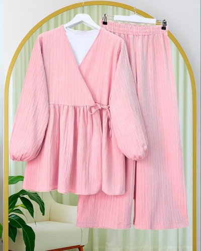 İçten Bağlamalı Tunik Bol Paça Pantolonlu Takım -Pembe