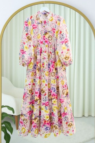 Karışık Çiçek Baskılı Yarım Düğmeli Parçalı Elbise -Sarı