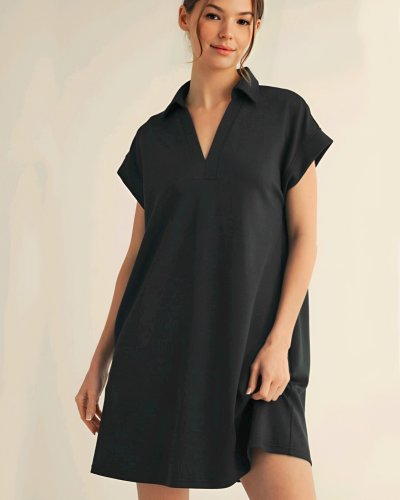 Gömlek Yaka Cepli Süprem Penye Elbise -Siyah
