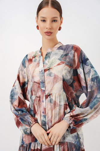 Desenli Uzun Tesettür Elbise 2585 - A. Kiremit
