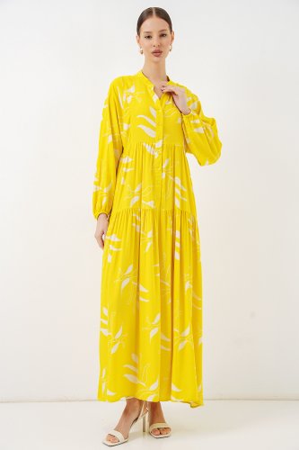 Desenli Uzun Tesettür Elbise 2585 - ASarı