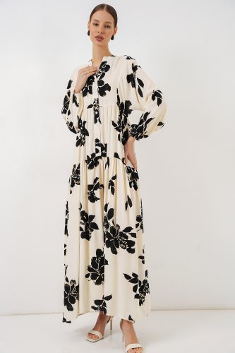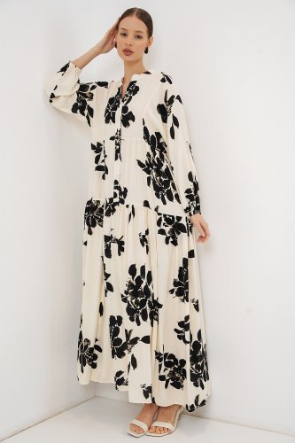 Desenli Uzun Tesettür Elbise 2585 - AEkru