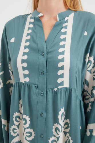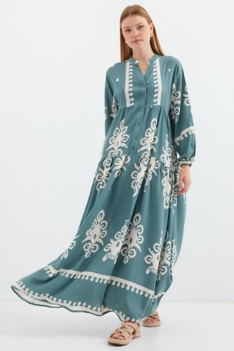 2423 Otantik Desenli Tesettür Elbise - F.Mint