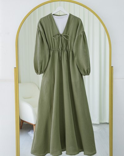 Yakası Bağlamalı Kolu Ve Beli Lastikli Müslin Elbise -Haki