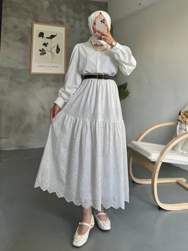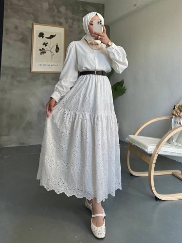 Parçalı İnci Detaylı Beli Lastikli Etek -Beyaz