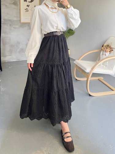 Parçalı İnci Detaylı Beli Lastikli Etek -Siyah