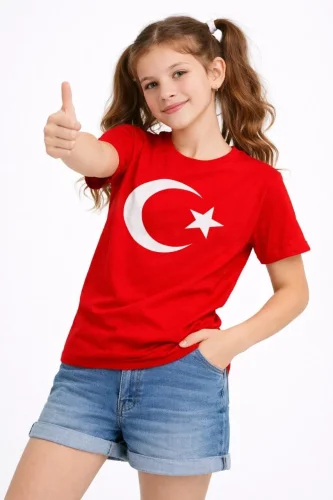 Kız Çocuk Tişört Bisiklet Yaka Ay Yıldız Bayrak Baskılı T-Shirt - Kırmızı