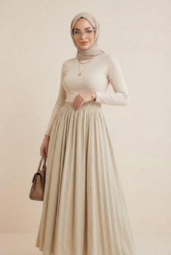 Beli Lastikli Astarlı Uzun Gofre Etek -Açık Vizon