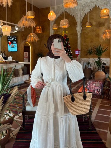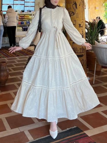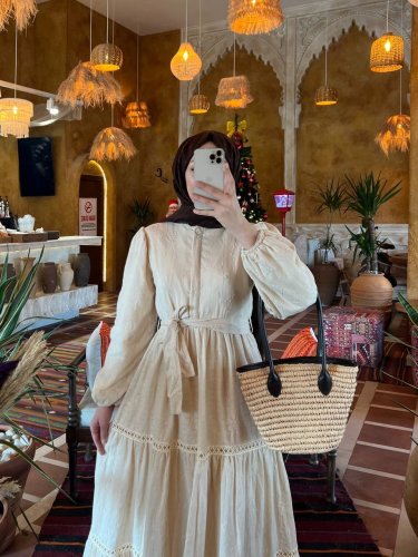 Eteği fırfırlı Dantel Şerit Detaylı Elbise -Bej