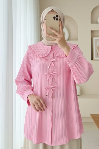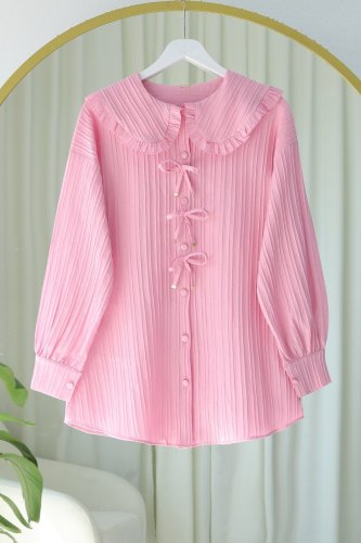Önü Kurdele Detaylı Düğmeli Önlük Yaka Gömlek -Pembe